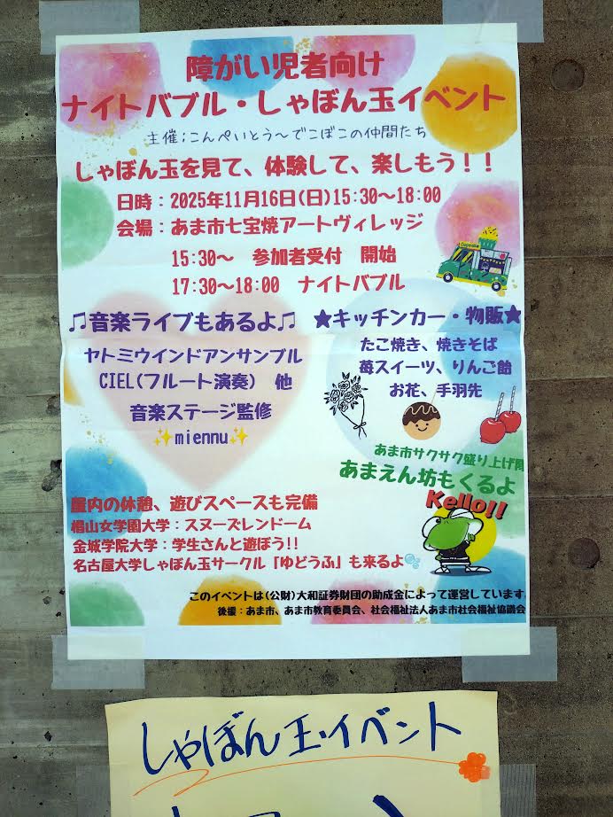 2025年11月16日(日)あま市七宝焼アートヴィレッジで行われた、”こんぺいとう~でこぼこの仲間たち”さん主催の障がい児者向けナイトバブル・シャボン玉イベントに参加しました。